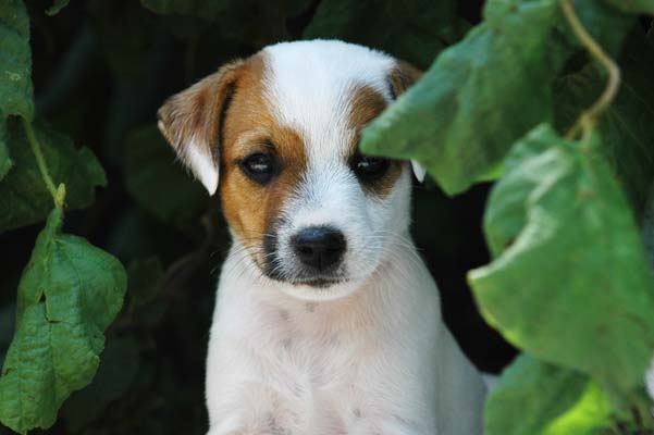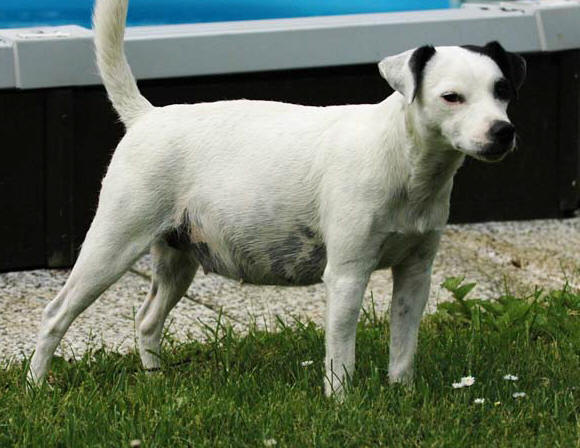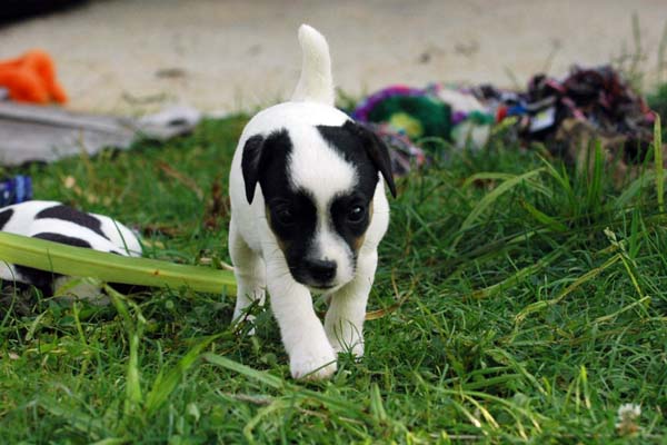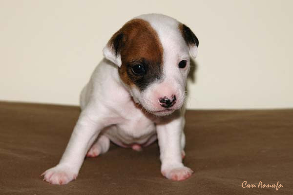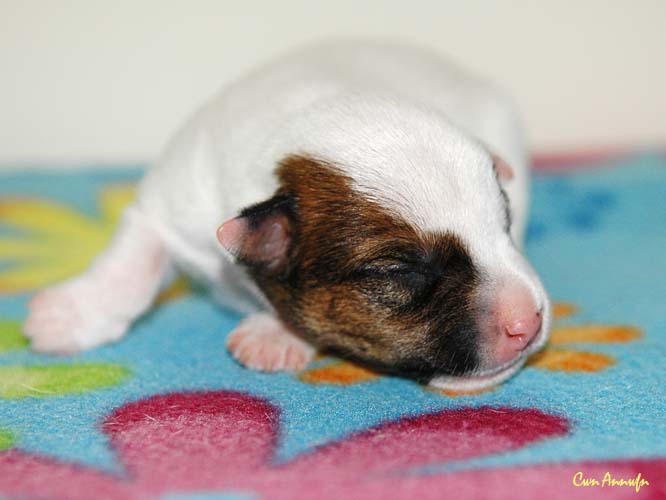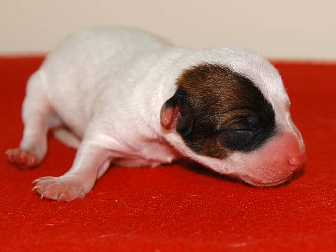 Hier der Erstgeborene, ein braun/weißer Rüde. Am linken Ohr hat er auch ein Abzeichen. |