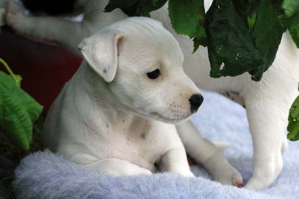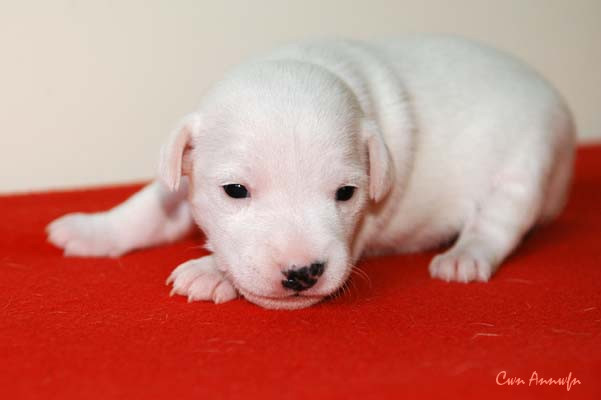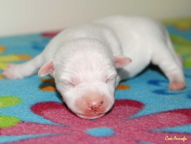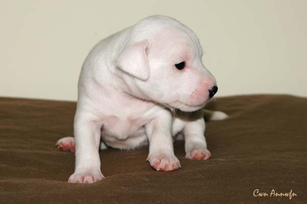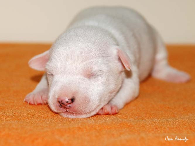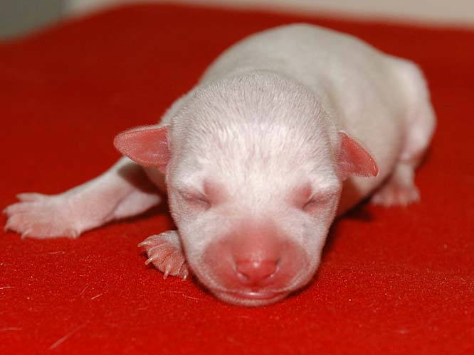 Die Größte von allen 6, eine weiße Hündin. Man beachte bitte den schwarzen Pigmentfleck links an der Nasenspitze;) Welche "genetische" Farbe sie hat wird sich erst zeigen, was man jetzt schon sagen kann ist, dass sie eine unglaubliche Zielstrebigkeit an den Tag legt wenn´s ums Trinken geht. Eberhard Trumler hätte seine pure Freude an ihrem Biotonus:) |
