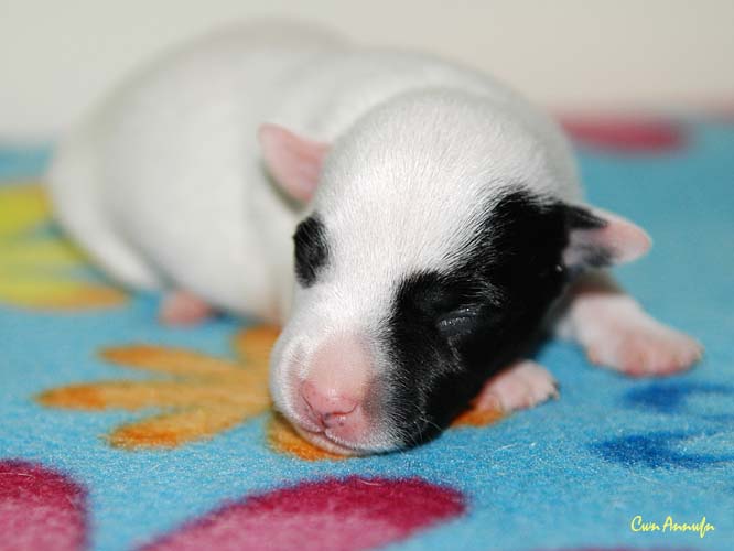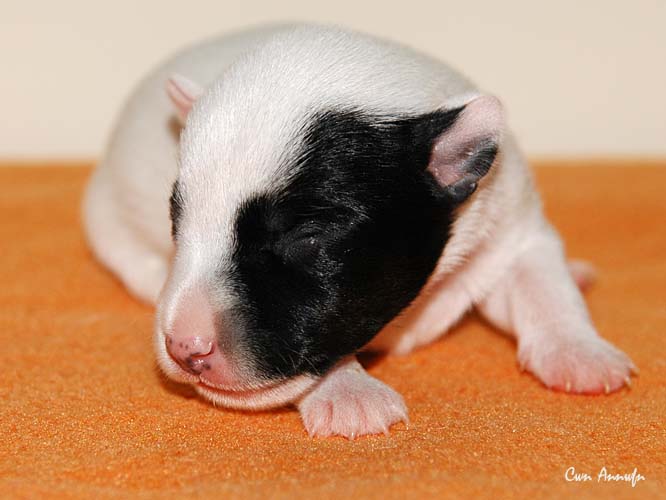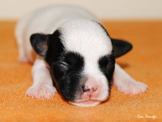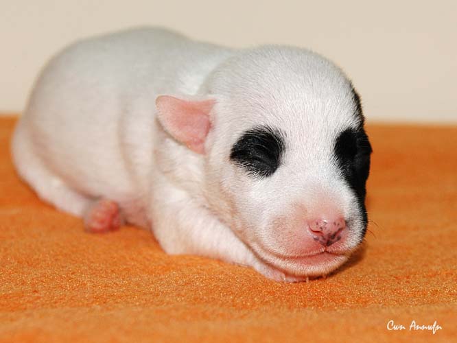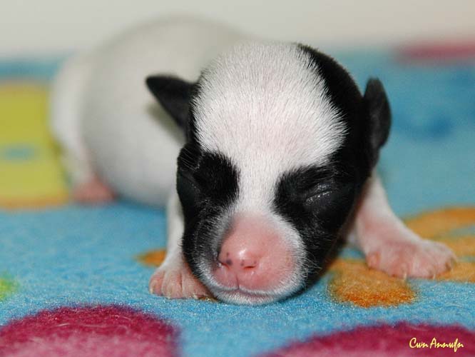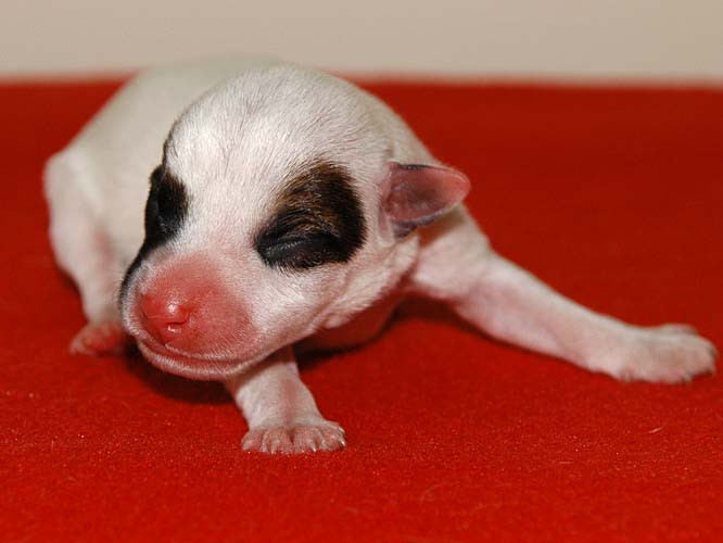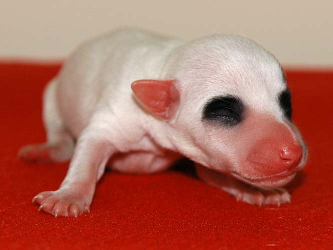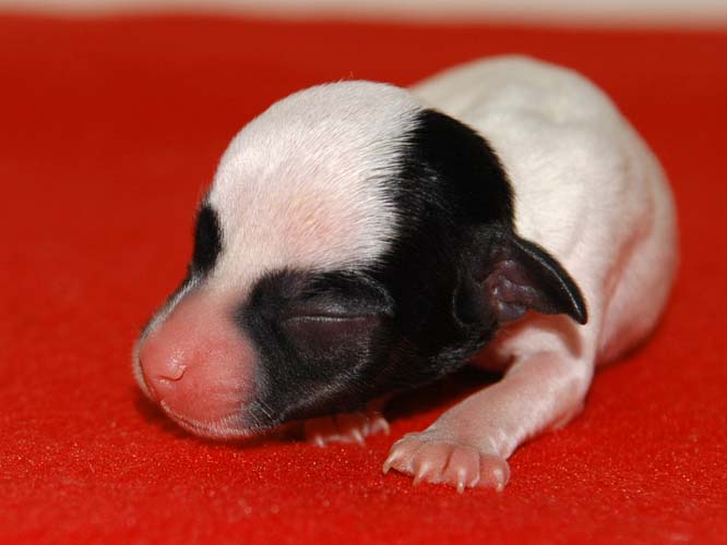 Das ist die fünfte, eine schwarz/weiße Hündin mit schwarzer linker Gesichtshälfte und Monokel rechts. Auch keine Riesin, hat in den ersten 24 Stunden aber satte 20g zugelegt. |