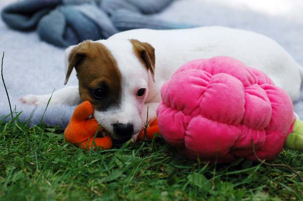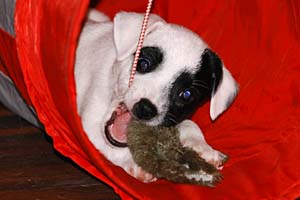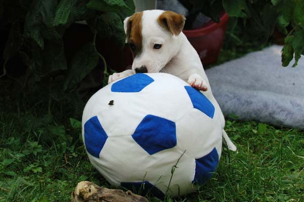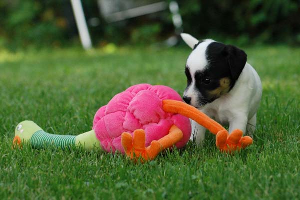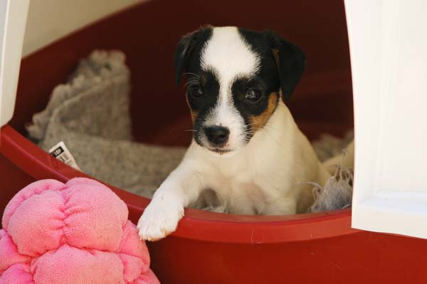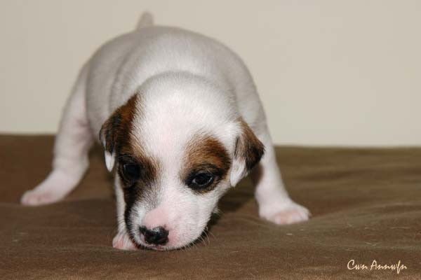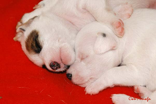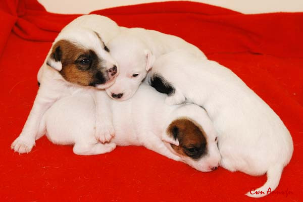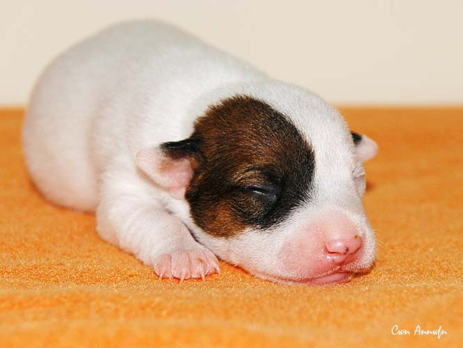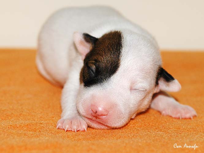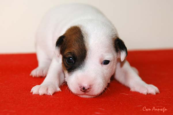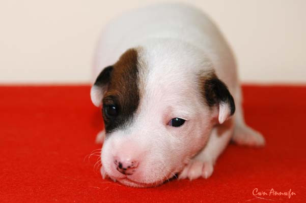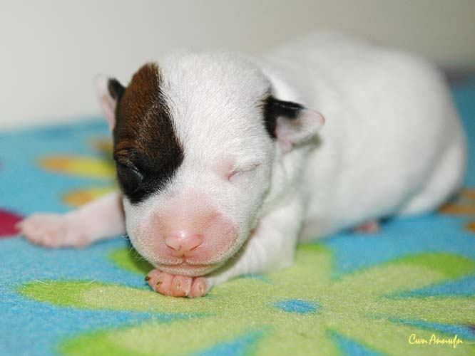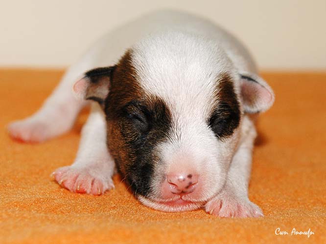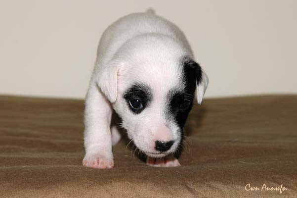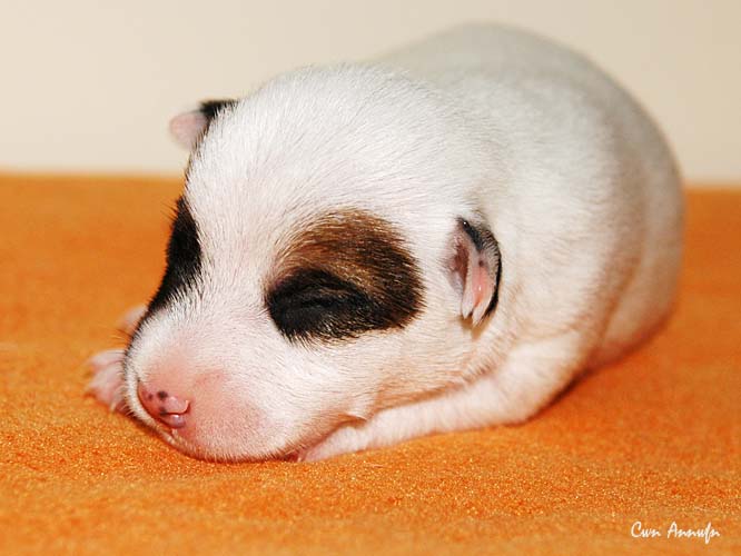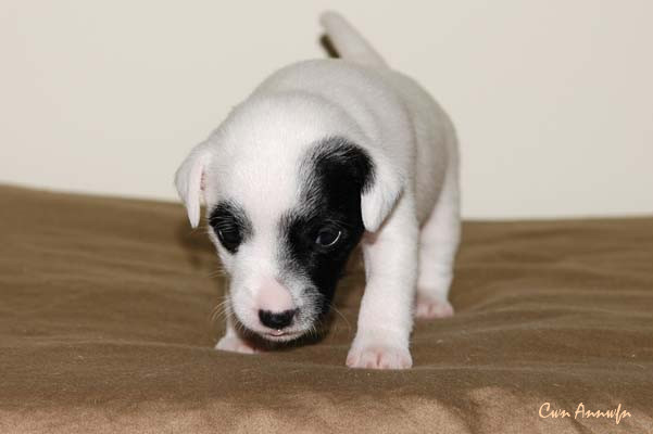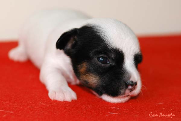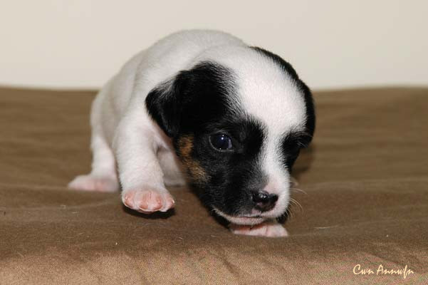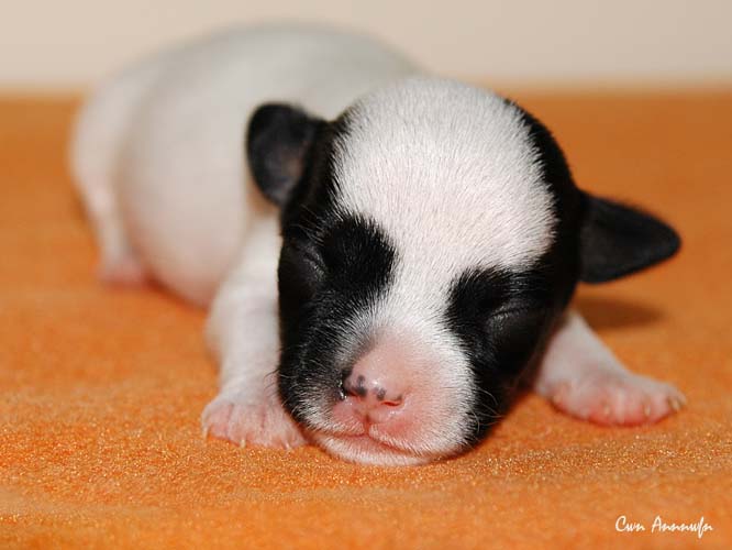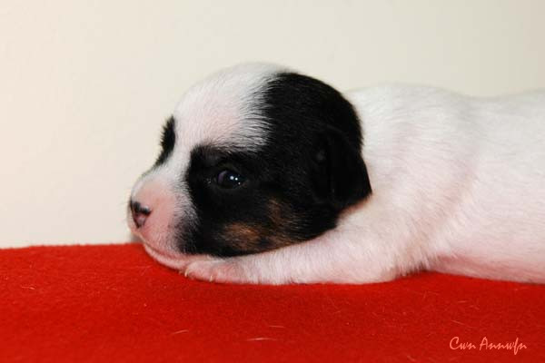 Der Letzte im Bunde, eine "Beinahekopie" seines braun/weißen Bruders. Er hat aber zusätzlich noch links ein Monokel. Heute Vormittag konnte ich ihn nur in letzter Sekunde davor retten aus der Wurfkiste zu türmen, offenbar ist es Zeit, den Rand zu erhöhen;) Ein echter Terrier halt:) |