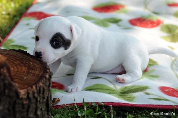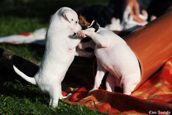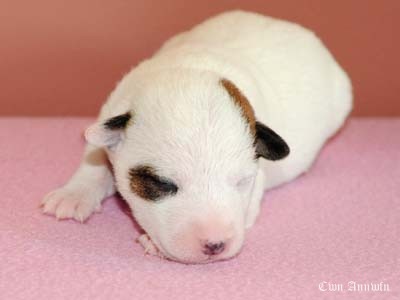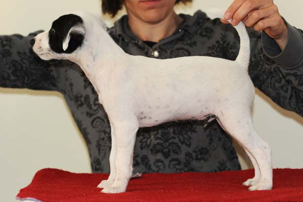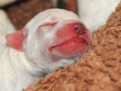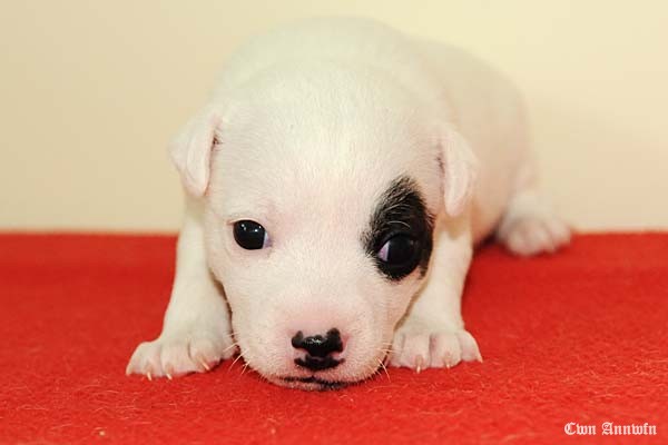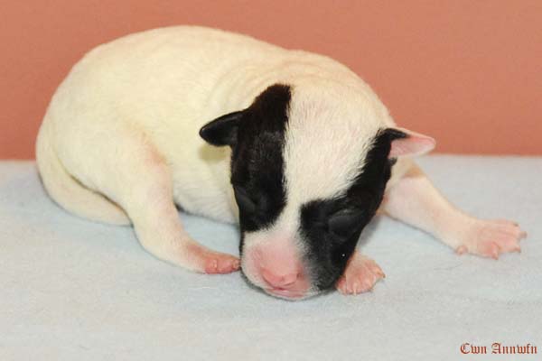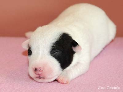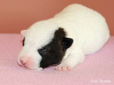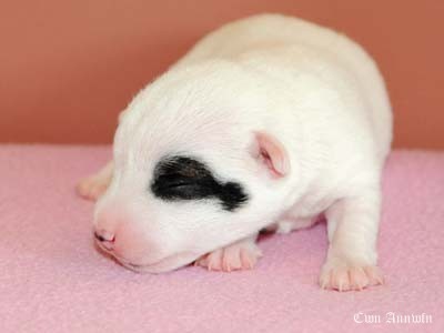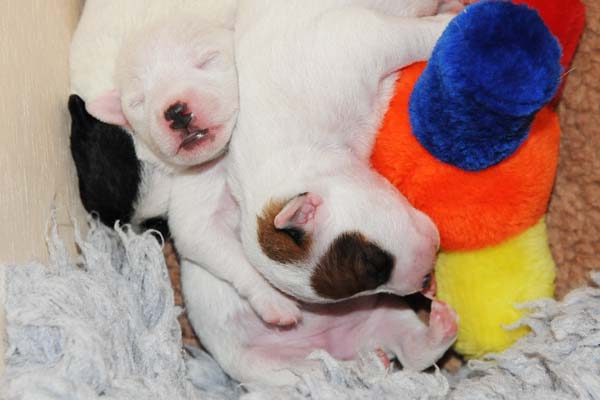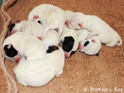 Beowulf(Titelheld eines angelsächsischen Heldenepos)Der zweite Rüde (schwarz-weiß) hat auf der rechten Kopfseite noch ein schwarzes Monokel und hatte bei der Geburt 174g. |