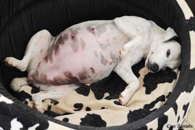 Hoffentlich hält Tica noch zumindest übers Wochenende durch, wenn auch schon alles für den großen Tag vorbereitet ist. Viel dicker sollte sie außerdem nicht mehr werden, sonst passt sie nicht mehr durch die Hundeklappe im Schlafzimmer. Ich würde sagen, der Endspurt steht kurz bevor! Und wenn wir uns auf dem Röntgenbild heute nicht arg verzählt haben und bei der Geburt alles gut geht *auf-Holz-klopf*, stehen uns ein paar wirklich arbeits- und welpenreiche Monate ins Haus ;o)