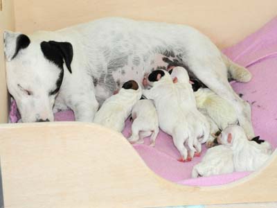 Die ersten 5 Tage liegen inzwischen hinter uns und unseren 7 Zwergen samt Mutter geht es gut, sehr gut sogar! Es ist die pure Freude sie zu beobachten, wie sie quirlig und zielstrebig das wichtigste Ziel in ihrem momentanen Leben - die Milchbar - anstreben, andocken und irgendwann ermattet herunterrutschen, nur um sich gemütlich in die Wurfkiste zu kuscheln und zu schlafen. Eh klar, was soll man denn auch sonst bei der momentanen Großwetterlage tun außer essen & schlafen:) Erfreuliche Konsequenz ihres Lebensstils ist eine rasante Gewichtszunahme, im rechnerischen Durchschnitt knappe 30g/Tag/Nase.