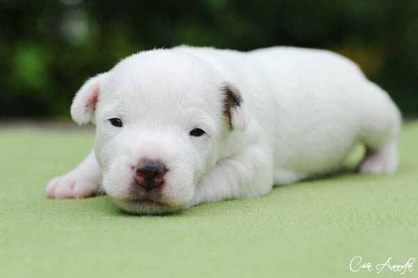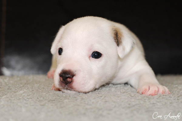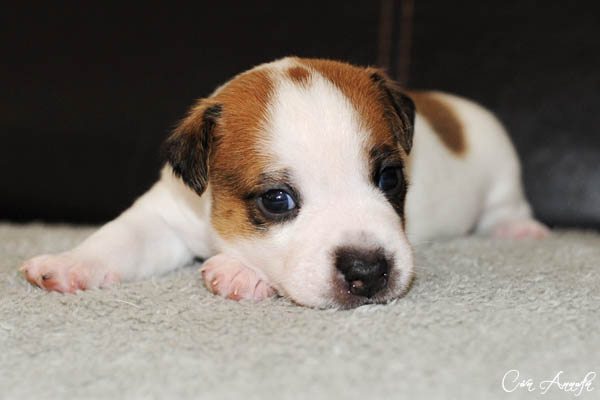 Das Haarkleid sieht bei allen sehr dicht und nach einem broken coat (Stockhaar) aus, also eigentlich ideal - wie erhofft. Ticking (kleine Farbtupfen im weißen Fell) kommt seit ein paar Tagen ebenfalls schon durch, man darf gespannt sein, wer wie viel davon abbekommt:) Der Aktionsradius und die Wachphasen steigern sich jetzt täglich merklich, wird dem Erkundungsdrang durch ein Welpengitter Einhalt geboten, wird das durchaus auch mal mit lautem Protest quittiert ;o) Inzwischen sind wir fast bei der Halbzeit angelangt, aber der richtig lustige Teil liegt in den kommenden Wochen noch vor uns!
