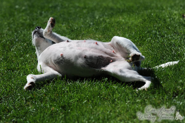 Im Garten ist inzwischen jeder Winkel inspiziert und auch im Wohnbereich und auf der Terrasse ist nichts mehr vor den Vieren sicher. Früher hatten wir Hundespielzeug und Kinderspielzeug - jetzt gibt´s nur noch Spielzeug, wobei dieser Begriff offenbar sehr dehnbar ist und sehr unterschiedlich interpretiert werden kann;) Die Spiele werden jeden Tag wilder, die Großen bringen sich immer mehr ein und dieser Tage werden wir wohl den ersten mini-Spaziergang wagen. Auch sonst steht in den nächsten Wochen noch viel am Plan - Entdeckungstouren in Wald & Flur, damit verbunden Autofahren, Ausflüge zum Schießplatz, das Kennenlernen von Verkehrslärm, Gewöhnung an Halsbänder und spielerisches Kennenlernen von Fuchslunte & Co. Aber natürlich nicht alles auf einmal, Rom wurde schließlich auch nicht an einem Tag erbaut und wir wollen die Welpen nur fördern, aber nicht überfordern. Und mit 5 Wochen ist zwar schon einiges los, aber es sind doch noch ziemlich kleine Miniaturterrier mit denen wir es zu tun haben:)