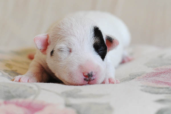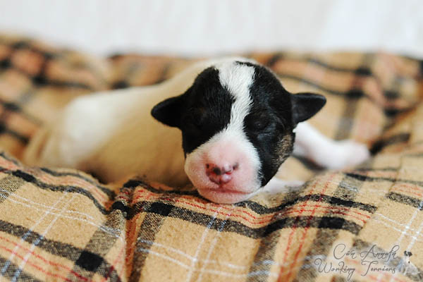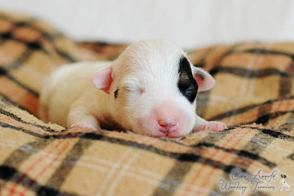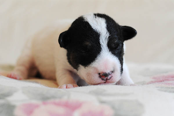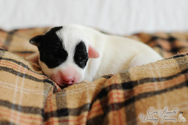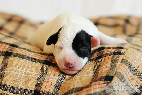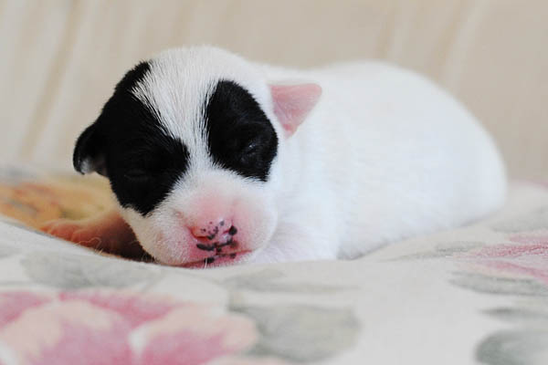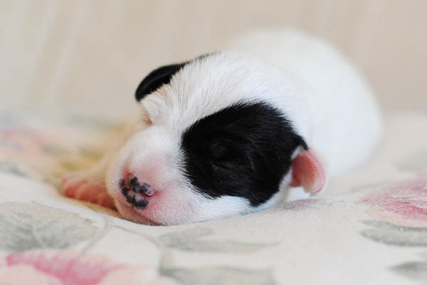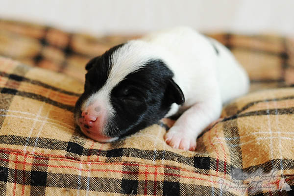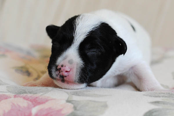 Nach einer unauffälligen Trächtigkeit mit nur mäßig großem "Babybauch" und von uns verordneter körperlicher Schonung lediglich in den letzten paar Tagen, hat Carrie am späten Nachmittag des 23. Mai binnen 2 Stunden 3 Rüden und 2 Hündinnen in schwarz/weiß und tricolor das Leben geschenkt. Es hätte nicht reibungsloser laufen können, was ich mir natürlich auch für die nun kommenden 2-3 Monate wünsche;) Auch ihren Mutterpflichten kommt Carrie vorbildlich nach, was sich in beeindruckenden Gewichtszunahmen der Kleinen widerspiegelt.