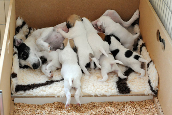 Kurz nach 8:00 Uhr Früh machte ein kleiner Hündinnenwelpe den Anfang, gut 3 Stunden und 6 Welpen später war es dann vollbracht - 7 auf einen Streich! Ebony macht ihre Sache wieder vorbildlich, somit steht dem Auftrag der ersten Woche - trinken, schlafen und wachsen - nichts im Weg.