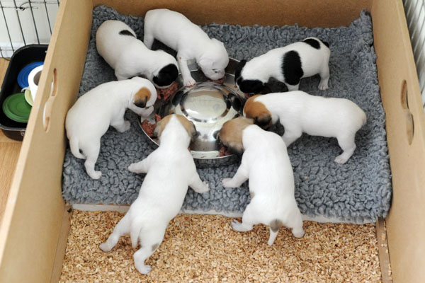 3 Wochen alt und es tut sich einiges - es wird richtig gespielt, man hat die anderen Hunden zum ersten Mal getroffen, es wird nun im großen Welpenauslauf im Wohnzimmer residiert und das erste Futter wurde mit Begeisterung verputzt. Dazu sind die gefürchteten Welpenzähne am Durchbrechen ;o) Der Aktionsradius ist natürlich immer noch sehr überschaubar, aber es tut sich jeden Tag ein bißchen mehr. Last but not least ist endlich die Namensfrage geklärt.